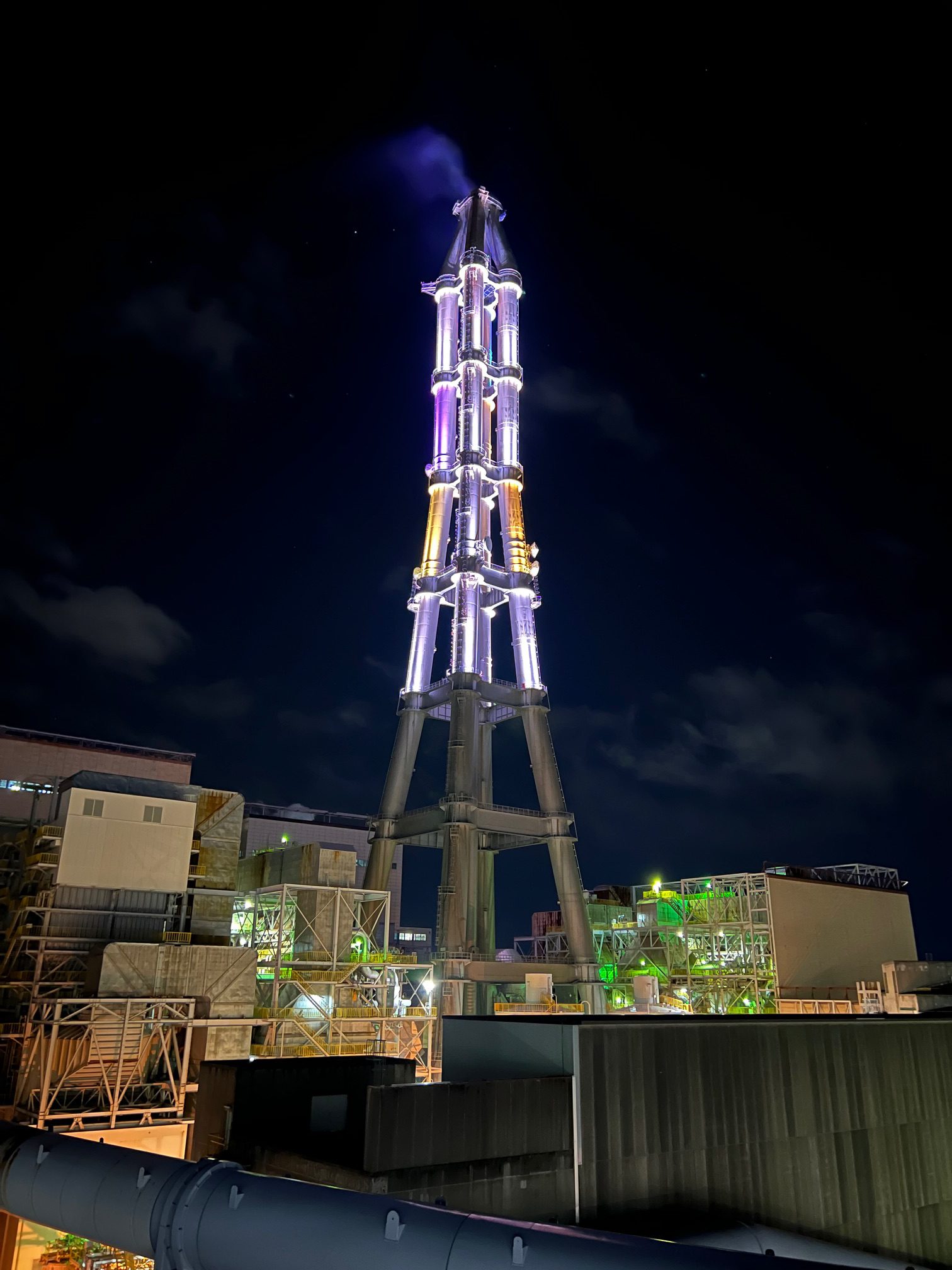 2018年12月21日より、8・9号機集合煙突のライトアップを実施しております。このライトアップの愛称『勿来ゆめライト』は、この『勿来』地区でライトアップをご覧になった皆さんに夢をもってもらいたいという意味の『ゆめ』、さらに発電所の電気で街も皆さんの心も明るくしたいという願いを込めた『ライト』を組み合わせて、『勿来ゆめライト』としました。